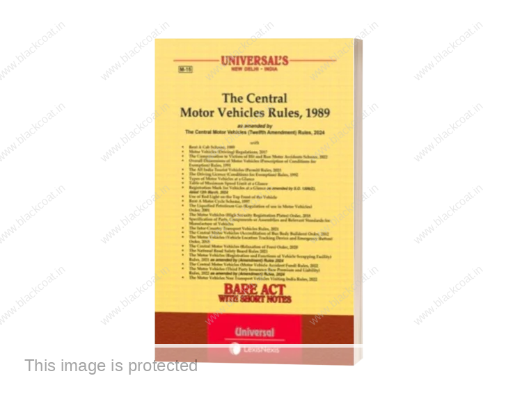 The Central Motor Vehicles Rules, 1989 as amended by The Central Motor Vehicles (Eighth Amendment) Rules, 2019 with • Rent A Cab Scheme, 1989 • Motor Vehicles (Driving) Regulations, 2017 • Solatium Scheme, 1989 • Overall Dimensions of Motor Vehicles (Prescription of Conditions for Exemption) Rules, 1991 • The Motor Vehicles (All India Permit for Tourist Transport Operators) Rules, 1993 • The Driving Licence (Conditions for Exemption) Rules, 1992 • Types of Motor Vehicles at a Glance • Table of Maximum Speed Limit at a Glance • Registration Mark for Vehicles at a Glance • Use of Red Light on the Top Front of the Vehicle • Rent A Motor Cycle Scheme, 1997 • The Liquefied Petroleum Gas (Regulation of use in Motor Vehicles) Order, 2001 • The Motor Vehicles (High Security Registration Plates) Order, 2018 as amended by (Amendment) Order, 2019 • Specification of Parts, Components or Assemblies and Relevant Standards for Manufacture of Vehicles • The Central Motor Vehicles (Regulation of Bus Service Between Amritsar and Lahore) Rules, 2006 • The Central Motor Vehicles (Regulation of Bus Service Between Amritsar and Nankana Sahib) Rules, 2006 • The Central Motor Vehicles (Accreditation of Bus Body Builders) Order, 2012 • The Motor Vehicles (Vehicle Location Tracking Device and Emergency Button) Order, 2018